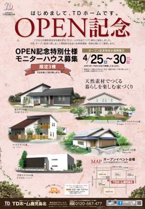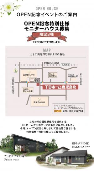 TDホーム鹿児島北の事務所(出水市高尾野町柴引2101番地)にてOPEN記念イベントを開催致します。今回、オープン記念と致しまして特別仕様のモニターハウスを募集&個性的な住まいを特別価格・特別仕様にてご提供します。家づくりをお考えの方はぜひこの機会にご相談ください。