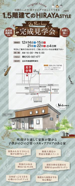 12/14.15.21.22の4日間、出水市高尾野町柴引で、1.5階建ての平屋スタイルハウスの完成見学会を開催致します。ゴロンと寛げる畳リビングに、吹抜けのある明るい広々LDK、部屋全体を見渡せる見晴らしGOODなキッチン、日向ぼっこもできるウッドデッキ、豊富な収納スペース、地震に強い安心構造など、施主様の思いが詰まった見応えたっぷりのお家です。お気軽にお越し下さい♪
