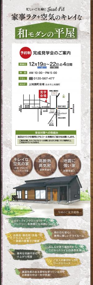 12/19〜22の4日間、出水市上知識町で、家事ラク+空気のキレイな和モダンの平屋の《予約制》完成見学会を開催致します。忙しいご夫婦必見の、水廻りが一直線の家事ラク動線、雨の日も安心のドライルーム、収納付きの小上がり和室や、ウォークインクローゼットや、パントリーなど豊富な収納、調湿効果のあるエコカラットを使用した室内は一年中快適!さらに、造作の洗面や、ご主人の夢が叶ったワークスペースなど、みどころいっぱいのお家です。お気軽にご予約・お問合せ下さい。