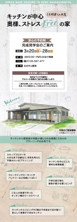 3/20〜28の9日間、出水市上鯖渕で、キッチンが中心の奥様、ストレスフリーの家の予約制完成見学会を開催致します。キッチンを中心にした便利な家事動線、ウォークインクローゼットやパントリーなど収納がいっぱい!他にも、ご主人の希望で作ったキッチン横のワークスペースやスキップフロアー、大きな床下収納など、将来を考えた平屋みたいなプランニングです。ぜひ、お気軽にご予約・お問合せ下さい。