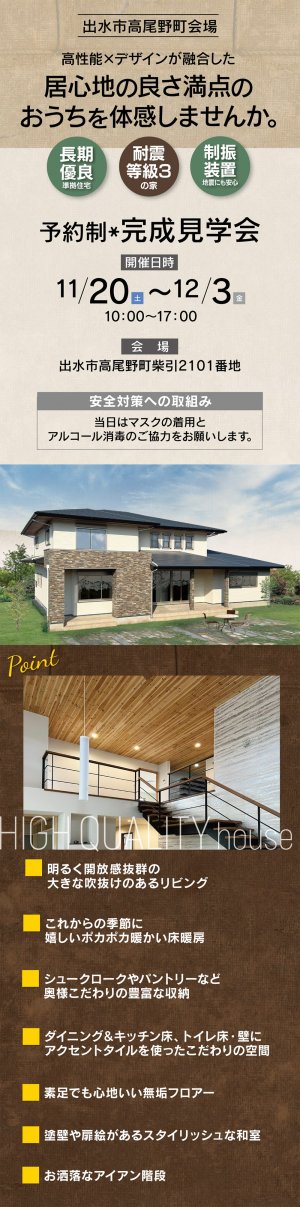 11/20(土)〜12/3(金)の14日間、出水市高尾野町で、高性能×デザインが融合した居心地の良さ満点のおうちの予約制完成見学会を開催致します。アイデア満載のプランをぜひご体感下さい♪
