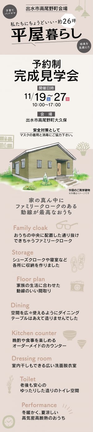 11/19(土)〜27(日)の期間、出水市高尾野町で、私たちにちょうどいい約26坪の平屋の予約制完成見学会を開催致します。