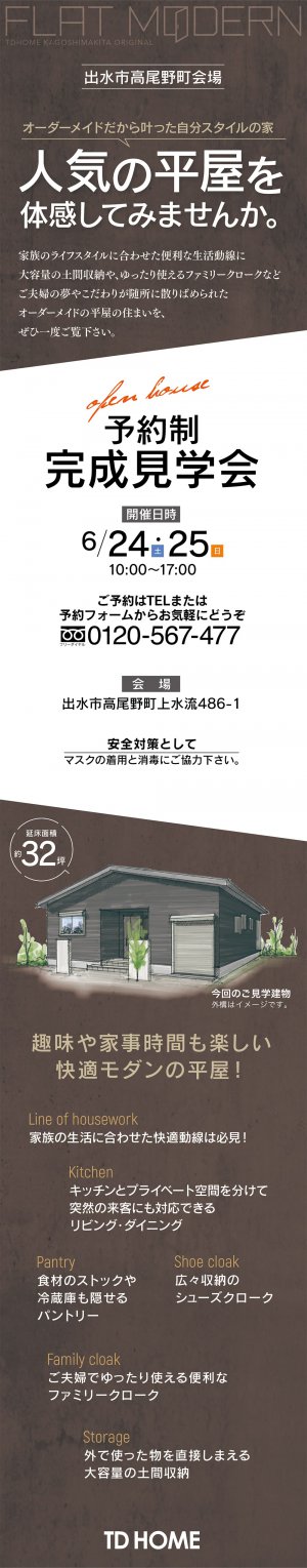 TDホーム鹿児島北は、鹿児島、出水、阿久根、長島町で新築の家づくりをしています。今回、出水市高尾野町柴引で完全予約制完成見学会(内覧会・オープンハウス)を開催中。